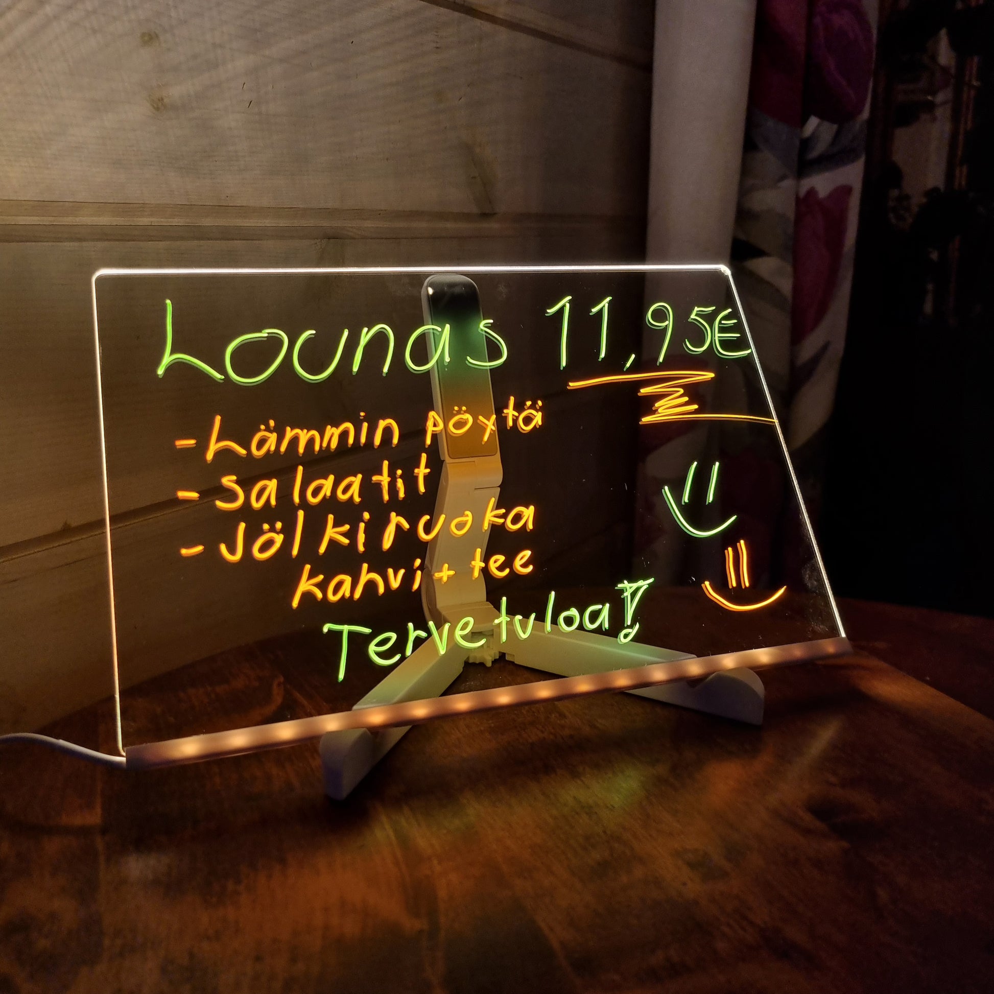 Herätä asiakkaidesi kiinnostus tyylikkäällä ValoFramella! Piirrä mukana tulevilla kynillä (7kpl eri värejä) haluamasi teksti ja kuvitus, esimerkiksi ajankohtainen tarjous, jonka jälkeen valokyltti hohtaa tyylikkäästi ja kiinnittää asiakkaidesi huomion.